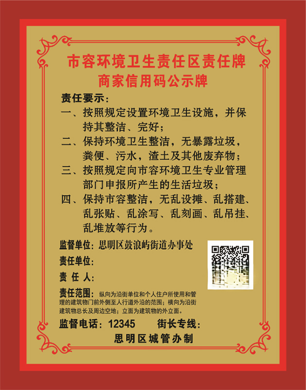 在此背景下,厦门市鼓浪屿-万石山风景名胜区管理委员会(以下简称“鼓浪屿管委会”)整合市场监管、城市管理等部门数据资源,创新打造“涉旅商家信用码”系统,将商家信用信息与“门前三包”市容环境卫生责任区管理信息深度融合,秉持“无事不扰”和“最小干预”原则,以政务诚信为引领,对全岛千余家涉旅商家实施“信用信息+卫生责任”双公示,形成了“部门联动、信息融合、社会共治”的鼓浪屿信用监管新格局。