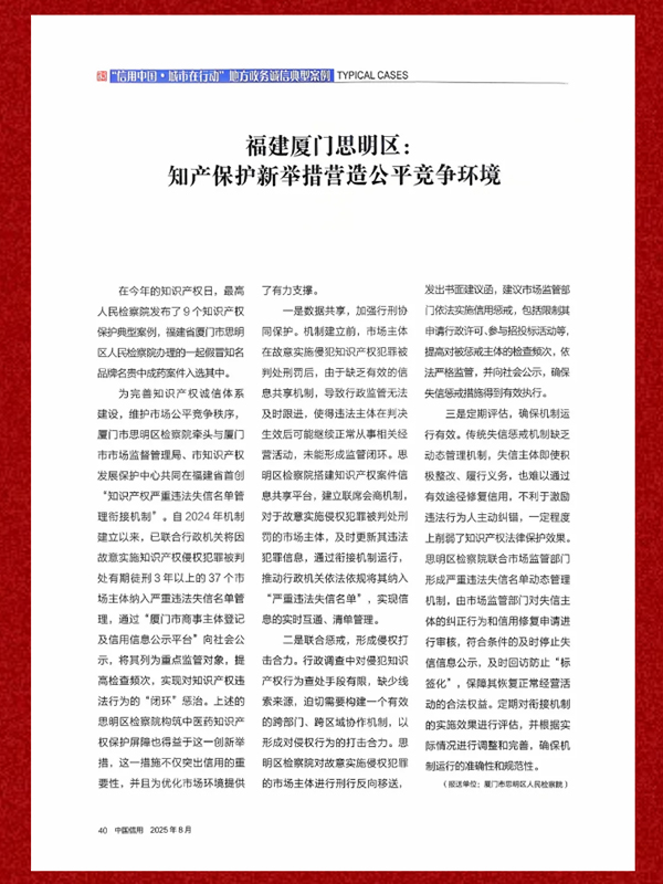 2025年8月,厦门市思明区检察院“福建厦门思明区:知产保护新举措营造公平竞争环境”案例,入选国家发展和改革委员会“信用中国·城市在行动”地方政务诚信典型案例——全国各地多措并举推动政务诚信建设百大案例(之五)。